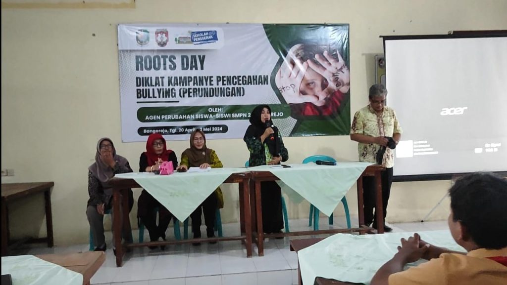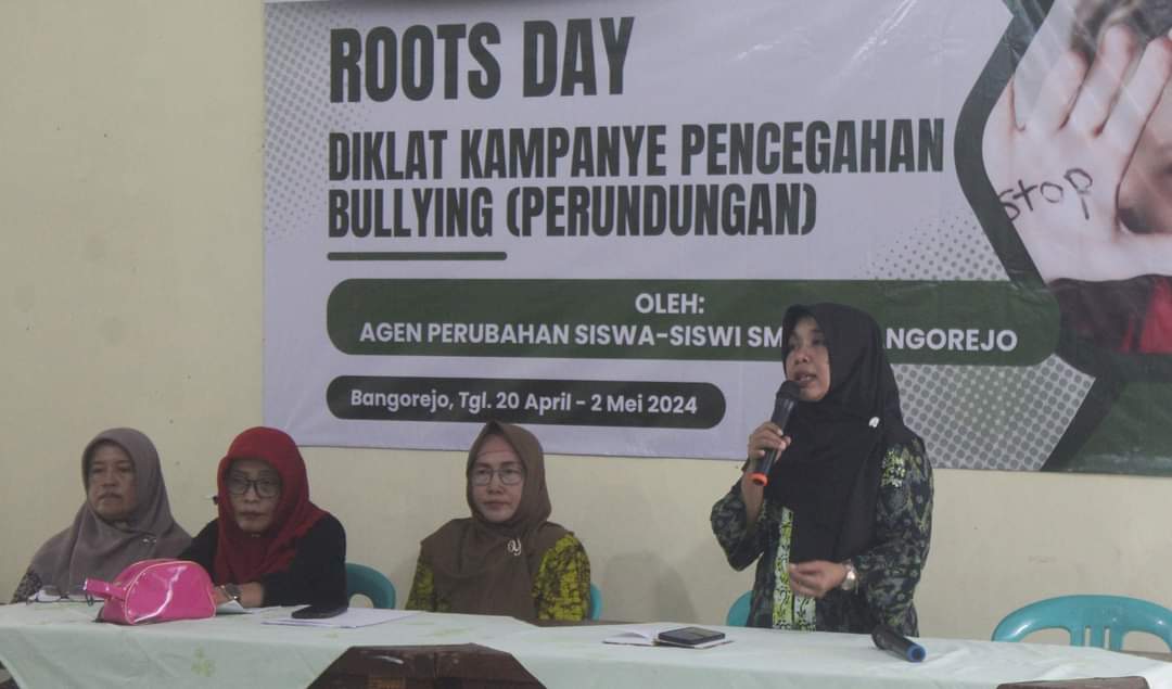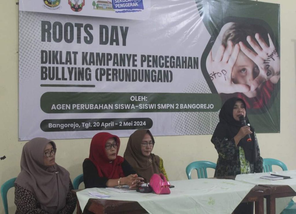 Ibu kepala SMPN 2 Bangorejo Ibu Pristianingsih, S.Pd membuka kegiatan Roots Day. Roots Day yaitu Hari Unjuk informasi tentang Pencegahan Perundungan di Sekolah yang diikuti oleh Siswa Agen Perubahan dan melibatkan semua elemen sekolah (siswa, guru, tenaga kependidikan, orang tua, penjaga sekolah, dan lain-lain).